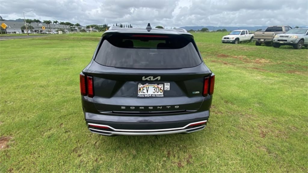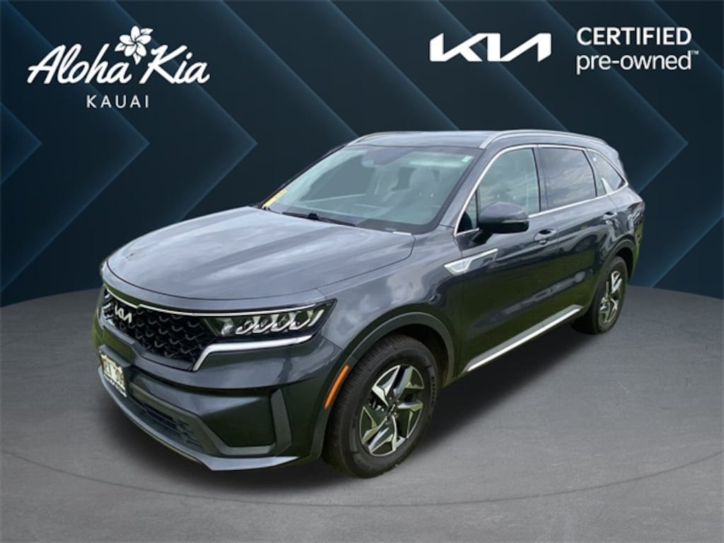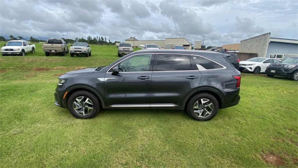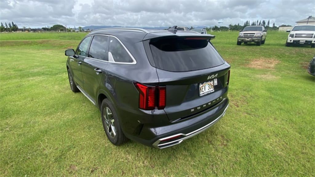 Certified. Platinum Graphite 2022 Kia Sorento Hybrid S FWD 6-Speed Automatic 3rd row seats: split-bench, 4-Wheel Disc Brakes, 6 Speakers, ABS brakes, Air Conditioning, Alloy wheels, AM/FM radio: SiriusXM, Apple CarPlay & Android Auto, Auto High-beam Headlights, Automatic temperature control, Axle Ratio: 3.510, Brake assist, Bumper Applique Texture, Bumpers: body-color, Cargo Cover, Cargo Net, Carpeted Floor Mats, Delay-off headlights, Driver door bin, Driver vanity mirror, Dual front impact airbags, Dual front side impact airbags, Electronic Stability Control, Emergency communication system: UVO Link, Exterior Parking Camera Rear, Folding Cargo Tray, Four wheel independent suspension, Front anti-roll bar, Front Bucket Seats, Front Center Armrest, Front dual zone A/C, Front reading lights, Fully automatic headlights, Heated door mirrors, Heated Front Bucket Seats, Heated front seats, Illuminated entry, Knee airbag, Leather steering wheel, Low tire pressure warning, Navigation System, Occupant sensing airbag, Outside temperature display, Overhead airbag, Overhead console, Panic alarm, Passenger door bin, Passenger vanity mirror, Power door mirrors, Power driver seat, Power steering, Power windows, Radio data system, Radio: AM/FM Audio System, Rear air conditioning, Rear anti-roll bar, Rear reading lights, Rear window defroster, Rear window wiper, Remote keyless entry, Roof rack: rails only, Security system, Smart Key w/ Push Button and Remote Start, Speed control, Speed-sensing steering, Split folding rear seat, Spoiler, Steering wheel mounted audio controls, SynTex Artificial Leather Seat Trim, Tachometer, Telescoping steering wheel, Tilt steering wheel, Traction control, Trip computer, Turn signal indicator mirrors, Variably intermittent wipers, Wheels: 7.0J x 17" Machine-Finished Aero Alloy. 1.6L I4 DGI Hybrid Turbocharged DOHC 16V LEV3-ULEV70
